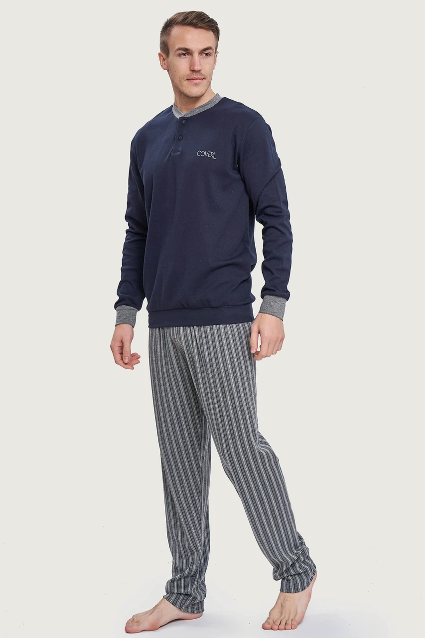 Модна чоловіча піжама з теплої бавовни, однотонний светр з довгими рукавами і круглим вирізом горловини на два гудзики. Джемпер синього кольору однотонний з логотипом бренду. Штани в смужку сірого кольору вільного крою без манжетів, задня кишеня.